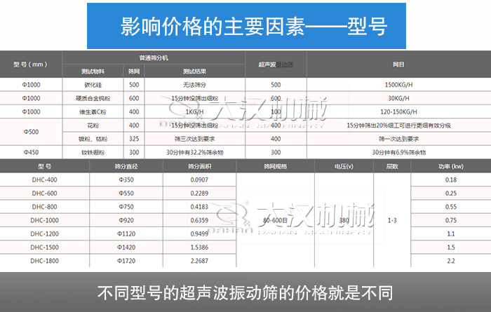 超聲波振動篩型號有:DHC-400、DHC-600、DHC-800、DHC-1000、DHC-1200、DHC-1500、DHC-1800、DHC-2000等八種標準直徑型號;不同型號的超聲波振動篩的價格就是不同,其中影響型號的的因素有:篩網(1—5層)、材質(不銹鋼、碳鋼)、振動電機(功率不同)等。