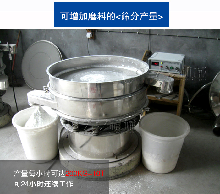 超聲波振動篩型號是從直徑φ600mm-φ1800mm等多種標準型號,可24小時連續工作,產量每小時可達200KG-10T,相比普通振動篩在產量上可提高2-10倍,不同的型號可以滿足磨料從小到大的各種產量需求。