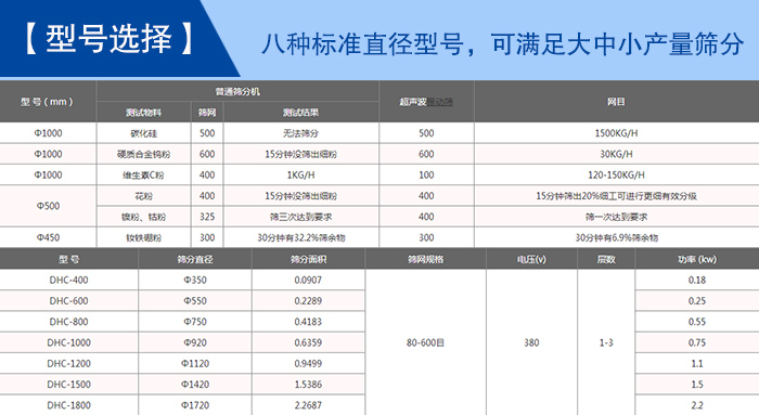 【型號選擇】—— DHC系列超聲波振動篩型號有:DHC-400、DHC-600、DHC-800、DHC-1000、DHC-1200、DHC-1500、DHC-1800、DHC-2000等八種標準直徑型號,可滿足100目—600目的細網篩分,每小時500KG—3000KG的大中小產量篩分。