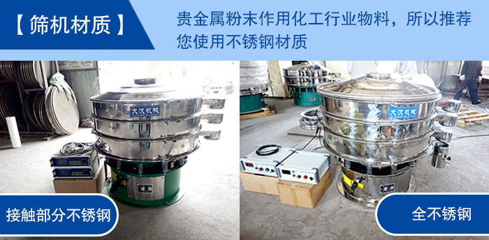 【篩機材質】—— 貴金屬粉末作用化工行業物料,所以推薦您使用不銹鋼材質,而常用的不銹鋼超聲波振動篩分為兩種結構,一種是整機均采用不銹鋼制成,另一種是與物料接觸不分為不銹鋼材質,底座為碳鋼材質,至于如何選擇就看您對衛生環境的要求以及成本預算了。