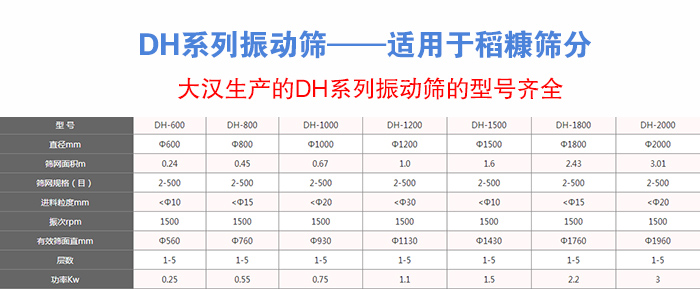 大漢生產的DH系列振動篩的型號有(直徑單位:mm):DH-400、DH-600、DH-800、DH-1000、DH-1200、DH-1500、DH-1800、DH-2000等八種標準型號。不同型號的DH系列振動篩滿足不同稻糠的篩分產量,下面小編就根據用戶常使用的兩款稻糠來為您做個簡單的介紹:
