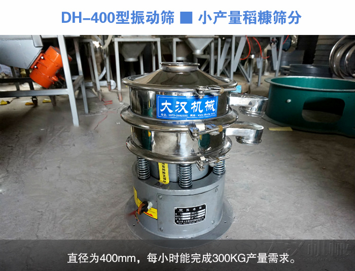 DH-400型振動篩:篩機直徑400mm,篩分直徑350mm,可安裝篩網:1-5層,轉速1440r/min,功率為0.18kw,每小時處理量為100kg-300kg。