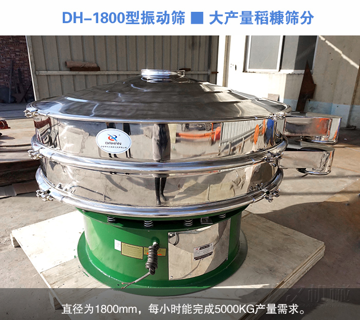 DH-1800型振動篩:篩機直徑1800mm,篩分直徑1720mm,可安裝篩網:1-5層,轉速1440r/min,功率為2.2kw,每小時處理量可達到3000kg-5000kg。