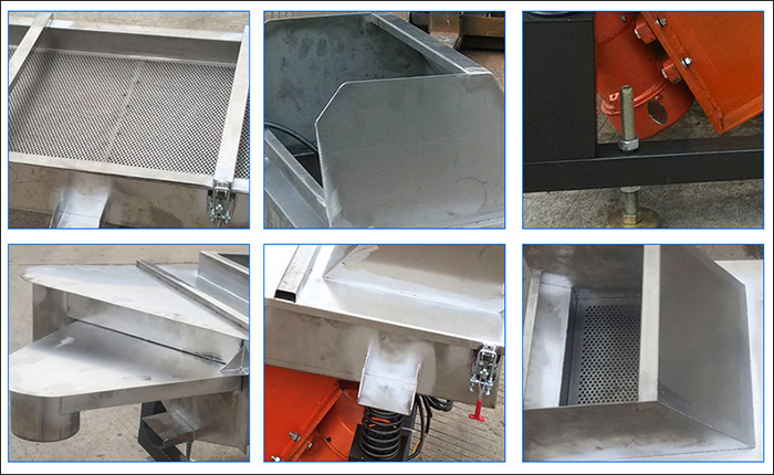 食品直線振動篩主要由篩箱、篩框、篩網、振動電機、電機臺座、減振彈簧、支架等組成。