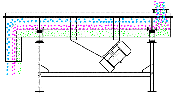食品直線振動篩采用雙激振器驅動,兩臺激振器做同步、反向旋轉時,其偏心塊所產生的激振力在平行于電機軸線的方向相互抵消,在垂直于電機軸的方向疊為一合力,因此篩機的運動軌跡為一直線。其兩電機軸相對篩面有一傾角,在激振力和物料自重力的合力作用下,物料在篩面上被拋起跳躍式向前作直線運動,從而達到對物料進行篩選和分級的目的。